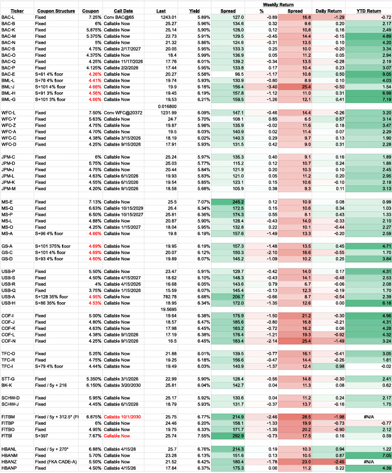 Fixed rate pref yields were relatively stable for the week despite treasury yields falling 10-15 bps (treasury yields fell, especially on Friday on renewed private credit fears. Thus spreads widened 10-15bps across most fixed rate issues (more in some cases for COF and FITB).